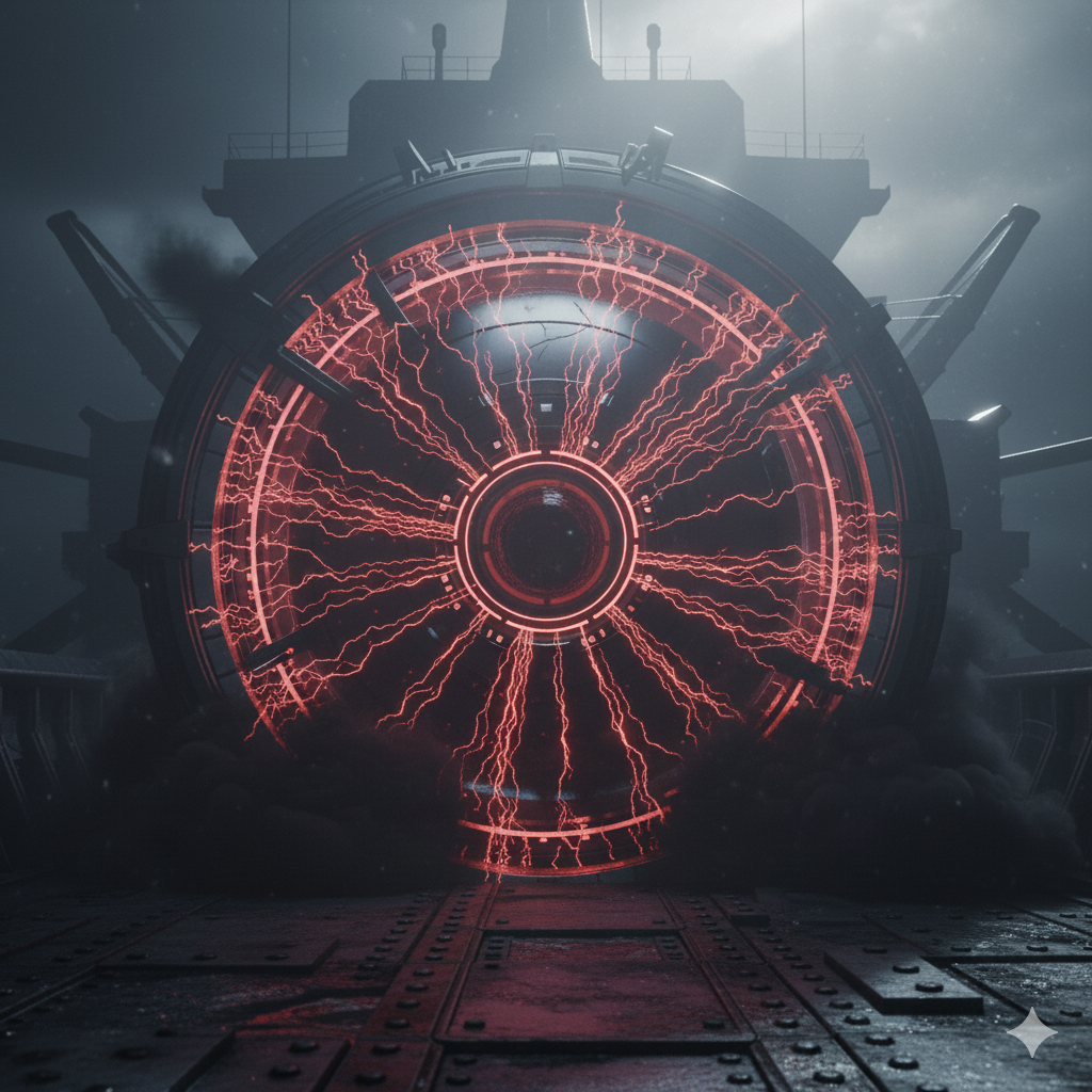 Its dark, spherical heart appeared inert, yet the air around it felt heavy—compressed, as though space itself were being restrained. Faint geometric veins pulsed across its surface, not with light, but with tension. It was not storing power, but the denial of release—a machine designed to hold reality at the edge of collapse.