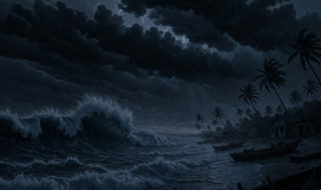 The tide had receded, leaving the sand slick and glimmering beneath the relentless noon sun. The beach stretched endlessly—a pale ribbon kissed by restless waves. Its shoreline was broken only by the jagged shadows of half-sunken wooden boats. Coconut trees leaned like tired sentinels over the barren dunes, their fronds brushing against one another in a hollow, wind-borne murmur.